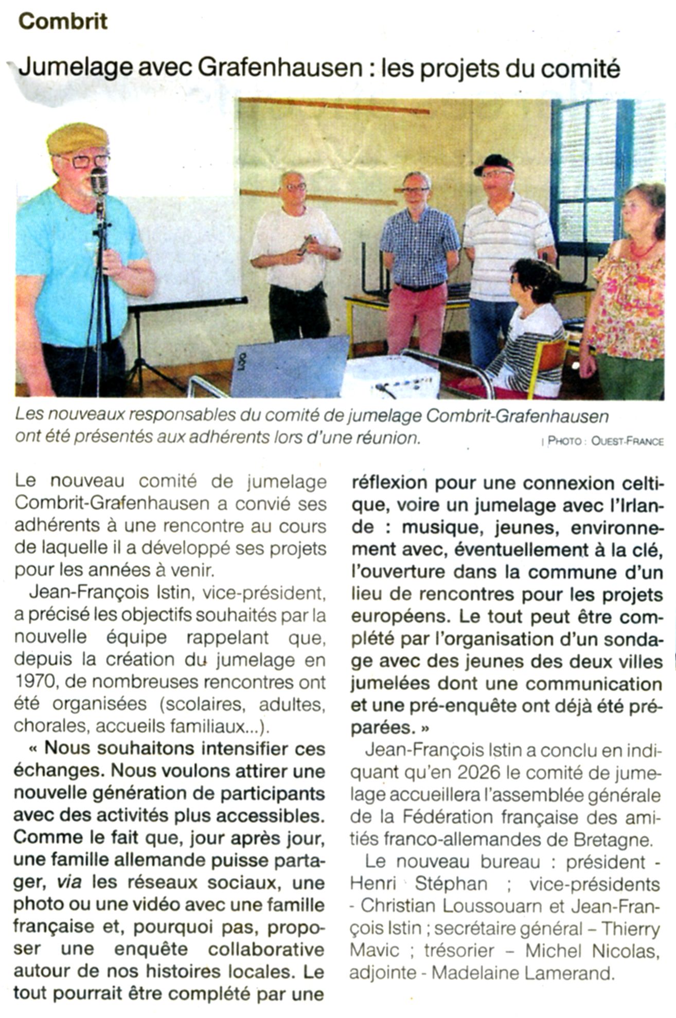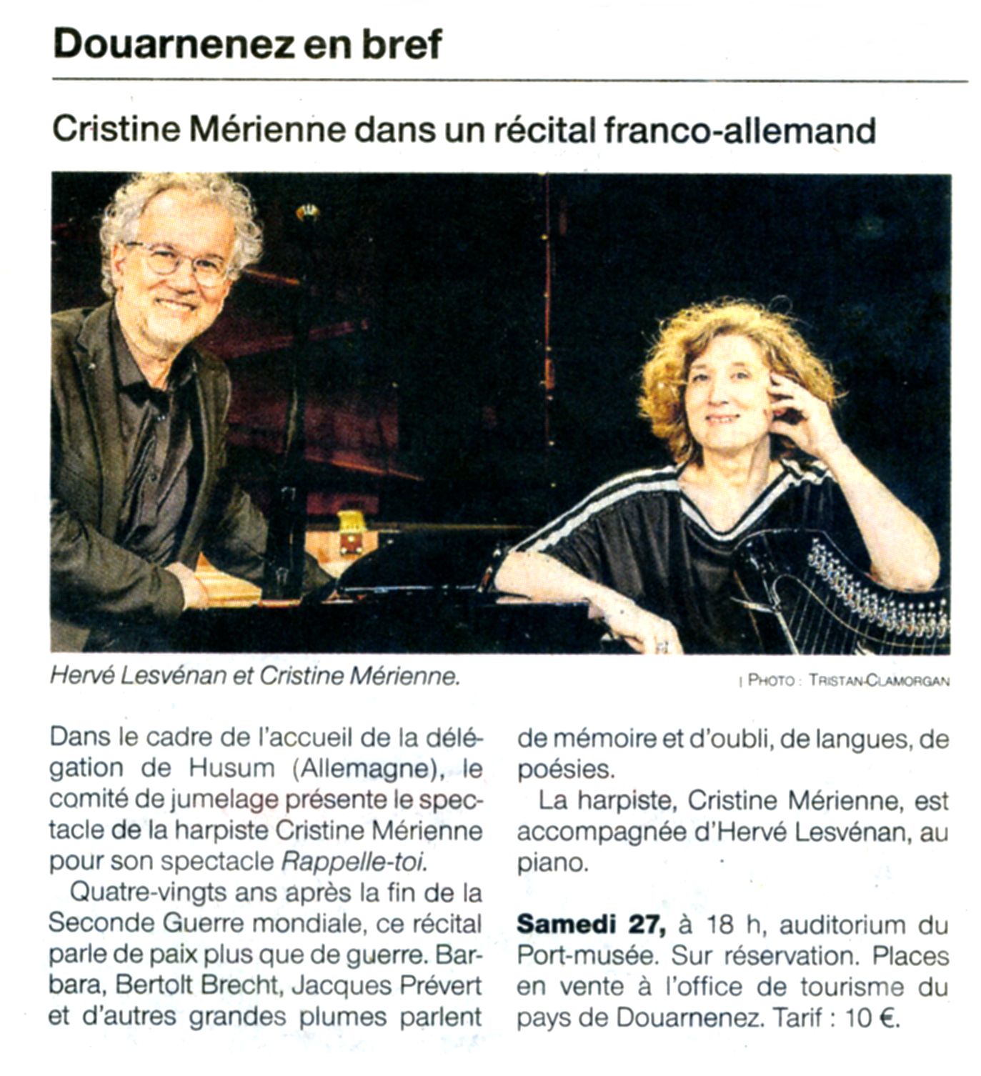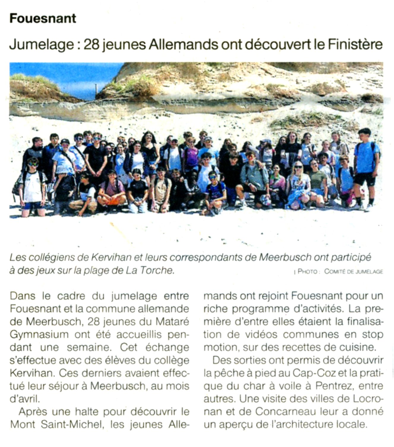 Samedi 25 octobre : Fête de la châtaigne à Locmaria, occasion de revoir le gingko planté à l'occasion du 25e anniversaire du jumelage QRS. > Affiche Dimanche 12 oct. : [copinage] Randoligo à Locronan > Affiche > Présentation 9 octobre 2025 : Après le concert du 27/09 à Dz, nouveau concert de Christine Mérienne à Fouesnant, 20h30 à l'Archipel. Réservations : 02 98 51 20 24 Samedi 11 octobre : Plomelin-Betziesdorf - Fête de la bière à PLomelin > Affiche Samedi 27 septembre 2025 : Le comité de jumelage DZ-Husum présente le spectacle "Rappelle-toi" de Christine Mérienne. > OF du 17/09/25 > Sur YouTube > Septembre 2025 : Fouesnant-Meerbusch, 18 jeunes Fouesnantais à RS > Article OF du 06/09/25 Juillet 2025 : Fouesnant-Meerbusch, 18 jeunes Allemands à Fouesnant > Article OF du 24/07/25 Juillet 2025 : Plomelin-Betziesdorf, bientôt 60 ans de jumelage > Article OF du 19/07/25 Juin 2025 : Pont-L'Abbé-Schleiden, un groupe d'Allemands en visite à Pont-L'Abbé > OF du 17/06/25. Juin 2025 : Combrit-Grafenhausen, les projets du comité. > Article OF du 16/06/2025 Juin 2025 : Fouesnant-Meerbusch, 28 jeunes Allemands en visite à Fouesnant > OF du 11 juin 2025 Mai 2025 : Combrit-Grafenhausen, accueil d'une délégation de Grafenhausen > Article OF du 30/05/25 Mai 2025 : Combrit-Grafenhausen, nouveau conseil d'administration > Article OF du 16/05/25 Mai 2025 : Jumelage Fouesnant-Meerbusch, programme des mois à venir > Article OF du 03/05 Dimanche 4 mai : [COPINAGE] à 18h au Terrain Blanc, concert de "Conexão Berlin", invité par les Aprèm' Jazz > Article OF > Écouter un morceau sur YouTube 27-28 avril 2025 : "Cinéma Européen" au Katorza, en collaboration avec les comités de jumelage. > Programme > Article OF du 19/04 3 avril 2025 : Des élèves de Douarnenez lisent des poèmes allemands en partenariat avec le comité Dz-Husum > article OF 19 mars 2025 : Douarnenez-Husum / AG du comité de jumelage européen de Dz > article OF 19 février 2025 : Assemblée Générale du comité de jumelage Pont-L'Abbé-Schleiden > article OF 25/02 - 02/03 : [COPINAGE] Festival QIFF organisé par "Gros Plan" ![]() 10 février 2025 : Assemblée Générale du comité de jumelage Fouesnant-Meerbusch > article OF 16 décembre 2024 : " Ces jeunes étrangers découvrent le Finistère " > article OF ( Roko et Nelly ont participé à notre atelier de pâtisserie ) Du 15 au 26 octobre [copinage] : Expo. de peintures de Catherine Huve à la Galerie XS > Affiche Dimanche 13 octobre [copinage] : "La Randoligo se mobilise contre le cancer du cerveau" > article OF 11 octobre 2024 : Jumelage Fouesnant-Meerbusch. " Une pièce de théâtre interprétée en allemand" ( article OF ) 28 août 2024 : Jumelage Fouesnant-Meerbusch. " Ils construisent le jumelage de demain " ( article OF ) 26 juillet 2024 : Soirée dansante et Moules-Frites du jumelage Fouesnant-Meerbusch. > affiche > article OF 10 et 11 juin : 3e édition du "Temps fort du cinéma européen" au Katorza. > Programme Juin 2024 : Le jumelage Combrit-Grafenhausen fête ses 50 ans > Deux articles OF 1er juin et 6 juin 15 mai 2024 : " Séjours interculturels pour ados avec Gwennili " > Article OF 23 avril 2024 : "Les Fantômes du Finistère", nouvelle enquête du Commissaire Dupin > article OF 22 avril 2024 : Installation à Brest de la nouvelle Consule Honoraire d'Allemagne pour le Finistère, Armelle Maltey. 6 avril 2024 : Récital de chansons françaises et allemandes (Barbara, Brecht, Prévert etc.) par Cristine Mérienne et Hervé Lesvenan > Affiche > sur YouTube ADHÉRER L'adhésion à l'association Quimper-Remscheid vaut pour une année civile. Le montant de la cotisation a été fixé à 15 € par l'AG de janvier 2017. Pour plus d'informations, cliquez ici. ![]() |
