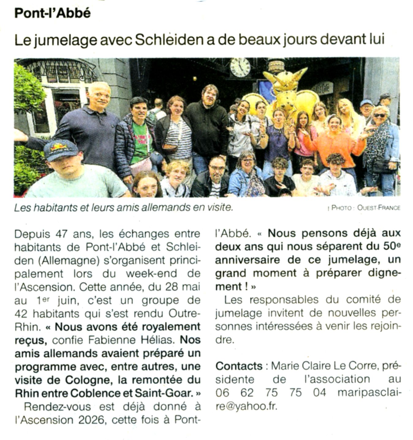 Samedi 18 octobre : Fête d'automne traditionnelle de l'association. du 22 au 29 septembre 2025 : Le groupe de musique bretonne DREMMWEL fait une tournée de concerts en Allemagne, en passant bien entendu par Remscheid. Jeudi 25 septembre : Stammtisch Dimanche 21 septembre : "Journées Européennes du Patrimoine" : Comme en 2024 Nous sommes présents dans le hall de la mairie avec les autres comités de jumelage. 18-21 septembre : Les aéromodélistes de CADQC accueillent leurs collègues du FMC de Wipperfürth, petite ville voisine de Remscheid. Mardi 9 septembre : Départ de la randonnée cycliste Quimper-Remscheid dans le cadre de Semaine Européenne de la Mobilité. Samedi 6 septembre : Nous participons au "Forum des Associations" avec les autres comités de jumelage quimpérois. Jeudi 26 juin : Stammtisch 28 - 31 mai : Voyage de l'Ascension dans le sens Remscheid > Quimper Jeudi 22 mai : Stammtisch Jeudi 24 avril : Stammtisch Jeudi 20 mars : Stammtisch Dimanche 16 mars : 4 Remscheidois participent au semi-marathon Locronan-Quimper > article Télégramme Jeudi 20 février : Stammtisch Dimanche 26 janvier 2025 : Assemblée Générale de l'association à l'hôtel Océania Jeudi 23 janvier 2025 : Stammtisch Jeudi 19 décembre : Stammtisch Samedi 7 décembre : Atelier de pâtisserie au Bourdonnel, à partir de 14h30. Samedi 30 novembre : Marché de Noël de Quimper-Remscheid sur la place Terre-au-duc Jeudi 21 novembre : Stammtisch Fin octobre 2024 : Participation de coureurs Quimpérois au "Röntgenlauf" de Remscheid. Samedi 19 octobre 2024 : Rencontre d'automne / Herbstfest au Bourdonnel. Jeudi 17 octobre : Stammtisch Octobre 2024 : Séjour à Quimper d'une cinquantaine d'élèves du GBG (RS) dans le cadre du jumelage avec le collège de la TA. > Article OF du 22 au 29 septembre : Séjour traditionnel d'un groupe de Remscheid au centre Azureva de Tregunc. Dimanche 22 septembre : Dans cadre des Journées du Patrimoine, nous tiendrons un stand avec les autres associations de jumelage dans le hall de l'hôtel de ville. Jeudi 19 septembre : Stammtisch de rentrée, comme toujours à partir de 20h, à la Maison de Quartier du Bourdonnel, rue Saint-Vincent-de-Paul. Samedi 7 septembre : L'association QRS tient un stand au Forum des Associations, à Penvillers ( N° 210, à l'extérieur ) Été 2024 : Job d'été à Quimper : Mathilda au foyer de Keraman. Jeudi 20 juin : Stammtisch Jeudi 23 mai : Stammtisch 8 - 12 mai : Échange de l'Ascension. Cette année ce sont les Quimpérois qui se rendent à Remscheid. Jeudi 25 avril : Stammtisch 9 - 18 avril : Le collège Laënnec (Pont L'Abbé) accueille des élèves de deux lycées de RS (Emma Herwegh-Gymnasium et Leibniz-Gymnasium) Jeudi 21 mars : Stammtisch Dimanche 17 mars 2024 : Des coureurs de Remscheid participent au semi-marathon Locronan-Quimper. Jeudi 22 février 2024 : Stammtisch Dimanche 28 janvier 2024, 10h30 : Assemblée Générale de l'association à l'hôtel Océania Jeudi 25 janvier 2024 : Stammtisch |